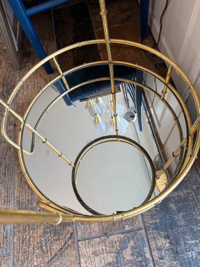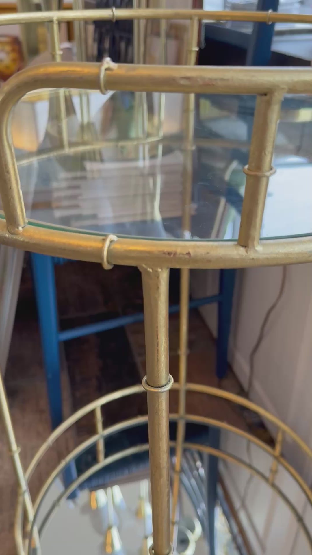 Glass top shelf, mirrored bottom shelf. Measures 31.5” tall and 18” in diameter.