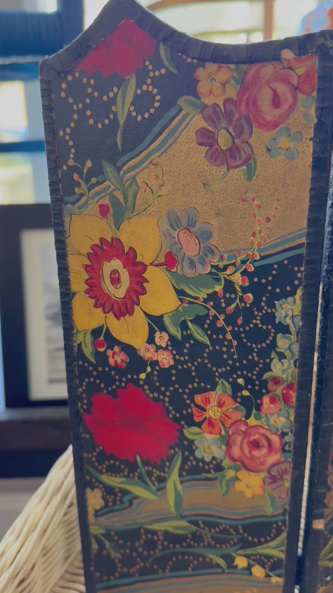Beautiful handpainted wooden trifold screen. Perfect for a shelf, a table, or to hang on the wall. Small imperfection where the paint has come off.