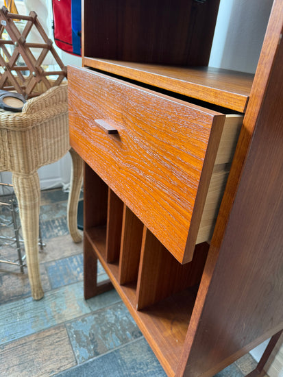 This piece is in great vintage condition. The wood is nearly perfect. It has two additional record slats that are missing the metal guides to keep them in place. There is also a back to the unit, which we have, that can easily be reattached. This back piece has the original Bornholm label. However we kinda like the backless look!