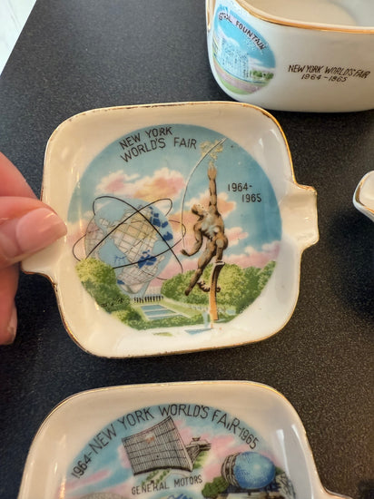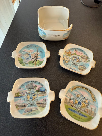 Set of 4 ashtrays plus holder, from New York World’s Fair